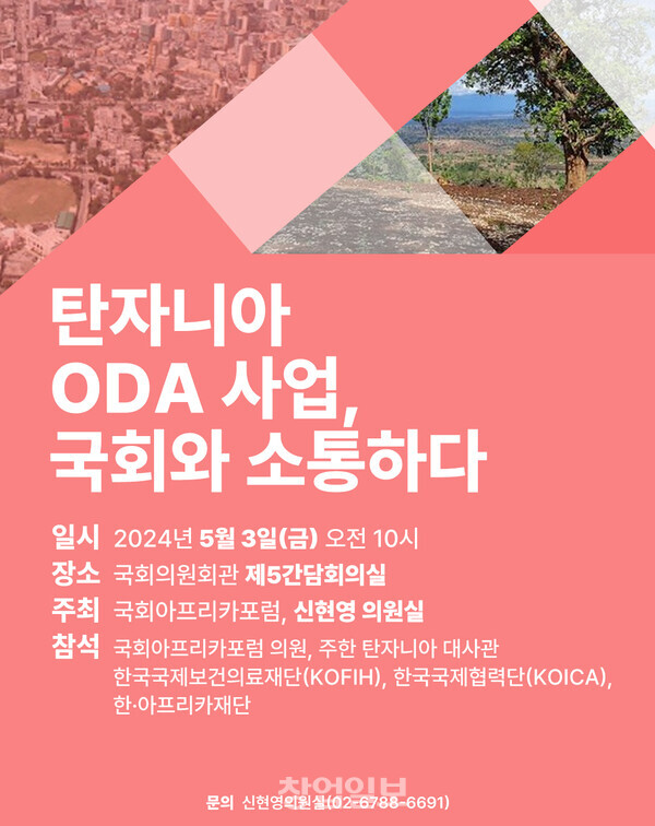 [공정언론 창업일보]국회 보건복지위원회 소속 더불어민주당 신현영 의원이 3일 오전 10시 국회의원회관 제5간담회의실에서 <탄자니아 ODA 사업, 국회와 소통하다> 간담회를 개최한다. 간담회는 국회아프리카포럼과 신현영 의원이 공동주최한다.
